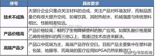 1、制品的生产技术还不成熟。大部分企业只重点关注材料的合成,关注产品对环境友好,而制品质量仍有很大提升空间,如餐饮具,其耐热耐水、机械强度与传统塑料相比,性能相差较远。