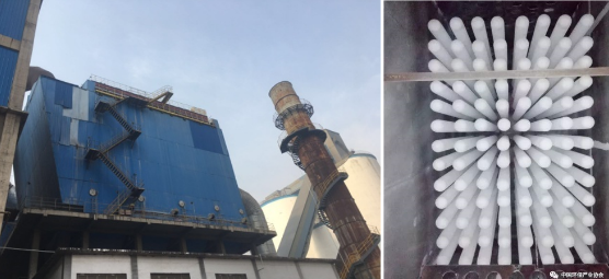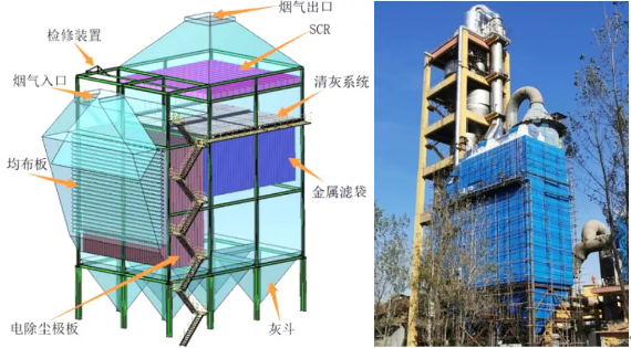 远致环保提出的高温除尘SCR脱硝一体化新技术,是将机械除尘、电除尘和袋式除尘三级除尘有机融合为一体,充分利用三种除尘方式的优点,有效解决了预除尘、催化剂流场均匀性、氨逃逸、催化剂堵塞及磨损等问题,实现烟气的高效净化。目前已在水泥企业成功应用(如图4)。测试结果表明,颗粒物浓度<10mg/m3,氮氧化物NOx<30mg/m3,氨逃逸浓度<2.5mg/m3。